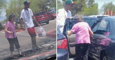 Ældre kvinde kæmper sig til bilen i varmen – så fanger kameraet hvordan teenager hjælper hende